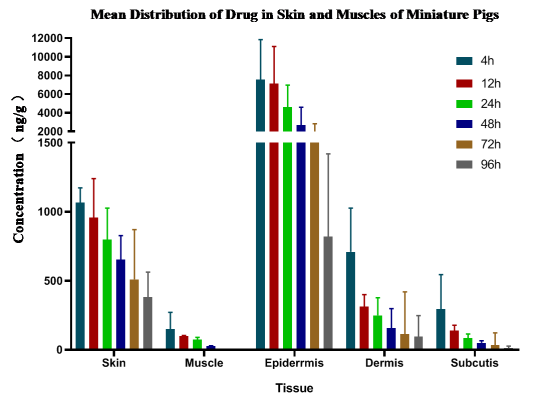 經皮給藥制劑的PK包括全身暴露和局部暴露的PK,局部暴露的PK可檢測表皮層、真皮層、皮下組織以及肌肉的藥物濃度。平臺已支持多個新藥順利完成IND申報。