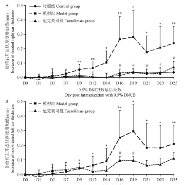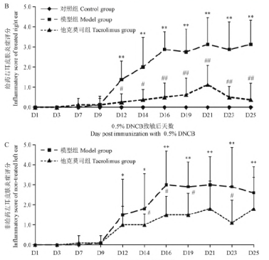 (1)分組與造模:將BN大鼠按體重隨機分為3組,分別為對照組、模型組、他克莫司組。對照組4例動物,模型組和他克莫司組8例動物。分組當(dāng)天記為D0。模型組和他克莫司組動物于D1、D3、D7、D9、D12、D14、D16、D19、D21、D23和D25,雙耳均勻涂抹0.5%DNCB溶液(丙酮∶橄欖油=3∶1) 40μL;對照組動物雙耳均勻涂抹丙酮-橄欖油溶劑40μL,造模期間大鼠佩戴伊麗莎白圈。