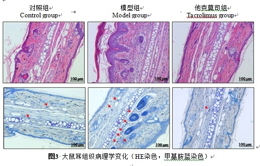組織病理學(xué)結(jié)果見圖3和表2。對照組耳部皮膚各層結(jié)構(gòu)清晰完整,表皮無增厚,真皮層散在性個別肥大細(xì)胞(箭頭指示);模型組右耳組織皮膚角化過度和/或不全、顆粒層增厚、基底細(xì)胞變性壞死、細(xì)胞內(nèi)水腫,伴隨真皮層大量的炎細(xì)胞浸潤,肥大細(xì)胞明顯浸潤;他克莫司組右耳皮膚各層結(jié)構(gòu)完整,表皮無增厚,真皮層散在性個別肥大細(xì)胞。
