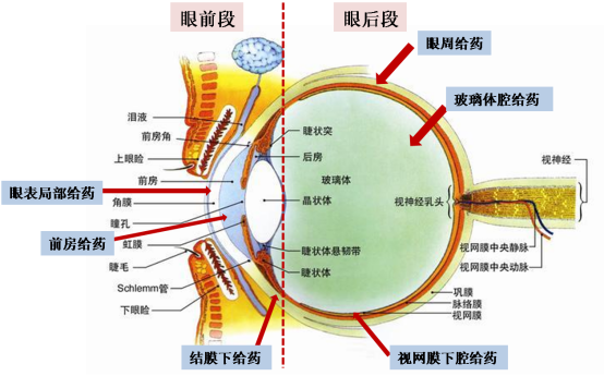 眼科藥物給藥途徑主要分類為三類:眼局部給藥,如滴眼液、眼膏、眼凝膠等;眼內給藥,如玻璃體腔注射、前房給藥、植入給藥等;眼周給藥,如結膜下、球后、球周、球筋膜下給藥等。