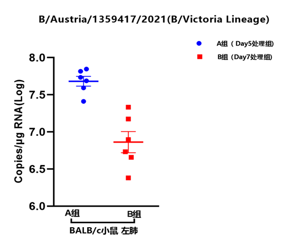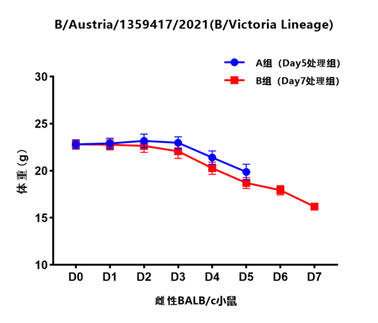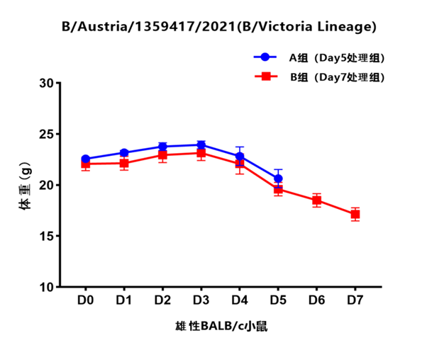 *對每只小鼠使用異氟烷進行麻醉,隨后取B/Austria/1359417/2021(B/Victoria Lineage) 病毒5倍稀釋液,通過滴鼻使小鼠感染0.05mL病毒株。
