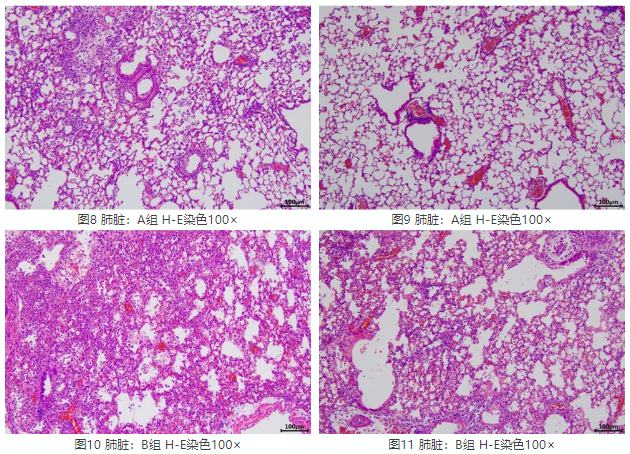 BALB/c小鼠滴鼻感染B/Austria/1359417/2021 (B/Victoria Lineage) 病毒5至7天,均會引起肺臟不同程度的病變,具體表現為細支氣管黏膜上皮細胞變性/壞死、脫落;肺泡/肺泡腔可見漿液/纖維滲出;肺泡腔/血管周圍炎細胞浸潤等(見圖8—圖11)。