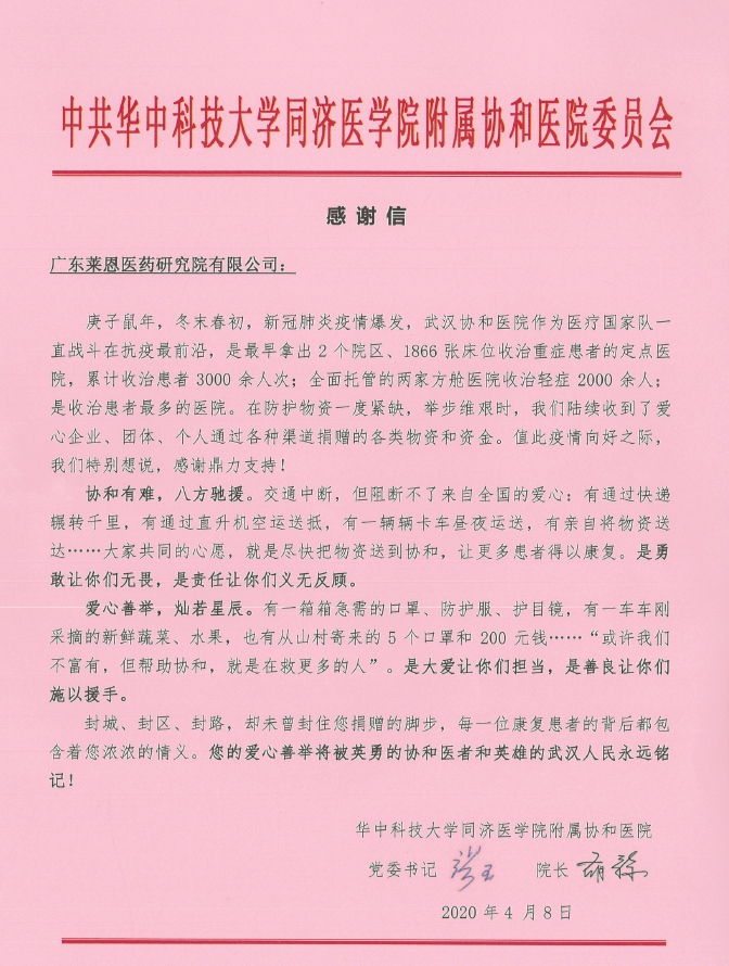 近日,萊恩醫藥收到一封來自華中科技大學同濟醫學院附屬協和醫院發來的感謝信,信中對萊恩醫藥在協和醫院抗擊新冠肺炎疫情關鍵時刻提供強有力的支持和幫助并致以崇高的敬意和誠摯的謝意。