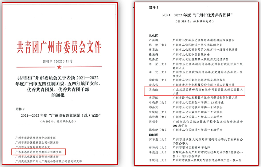 喜報!熱烈祝賀萊恩團支部榮獲“廣州市五四紅旗團支部”稱號、 實驗技術人員吳先煥同志榮獲“廣州市優秀共青團員”稱號
